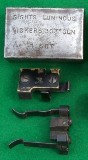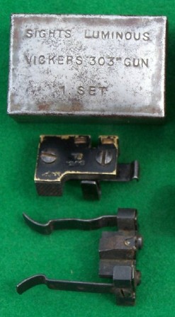 During WWI, the British needed sights that would allow the Vickers to be used under reduced-light conditions so clip-on night sights were developed and introduced. The first version utilized vials of glowing radium as the light source. Eventually, three different models of reduced-light sights were developed. The first and second versions both used glowin-the-dark technology. The third version depended natural light to function. Each set of sights was issued in a fitted steel case. The third model front sight does not go into the case. IMA has an excellent write-up about the sights (http://www.scribd.com/doc/49056076/Vickers-Night-Sights). Click the picture for larger Image.